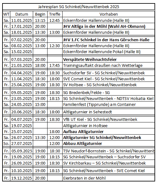 Jeden Freitag richtet unsere AH-Mannschaft in den Sommermonaten ihre Freundschaftsspiele aus. Ab Oktober wird in der Hans-Goerschen-Halle in Schinkel von 18:00 - 20:00 Uhr trainiert.